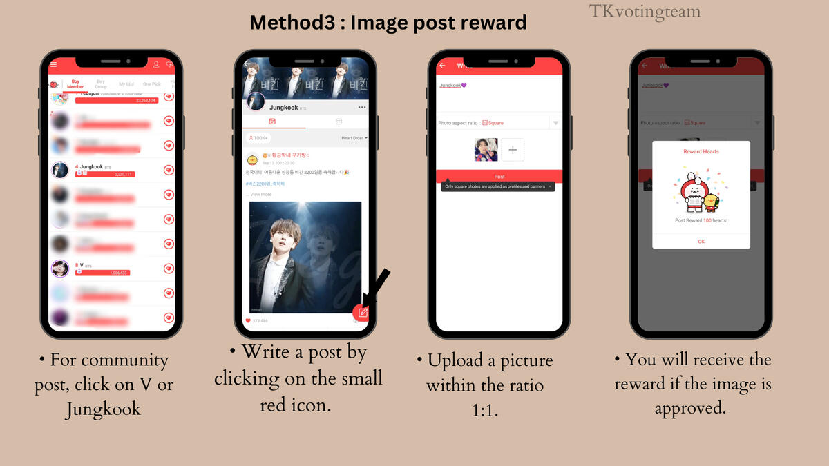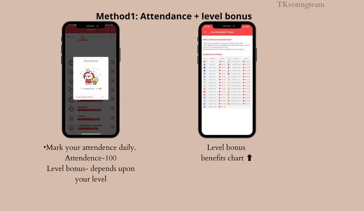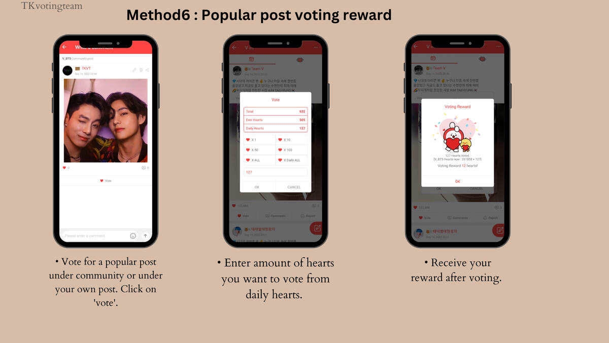 Use them to vote on community posts to earn EH.✴Accumulated votes: The no. of votes you have voted for Tae or JK. It determines your level.